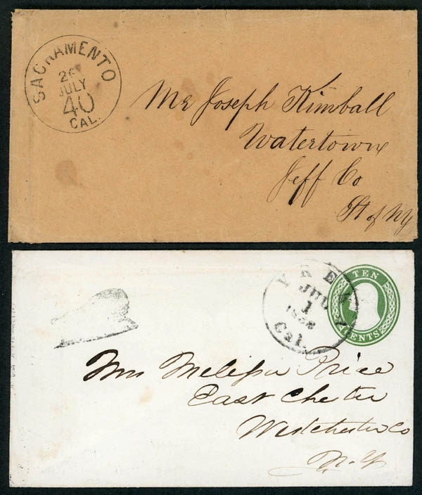 U.S. Covers by State, California, 5 Better, incl. ms. Ukiah, 1861, stampless Sacramento, straightline stampless Columbia, etc., overall sound with decent markings. All covers scanned on site.