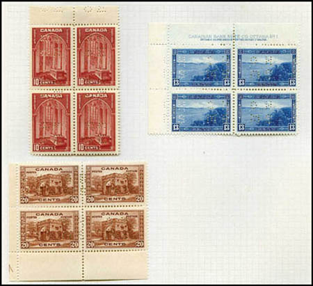 Canada, Perfin Officials 1928 to 1946. Group of 13 multiples, mostly marginal blocks of 4 or 6 and mostly n.h., all different except two #CO1, mostly n.h., incl. #O242, OC6 plate blocks. Scott $1,076+. Estimate $250.