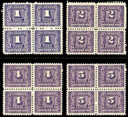 Canada, Postage Dues, 1930-32, 1¢-10¢ complete, blocks of 4, #J6-J10.