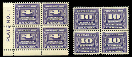Canada, Postage Dues, 1933-34, 1¢-10¢ complete, blocks of 4, #J11-J14.