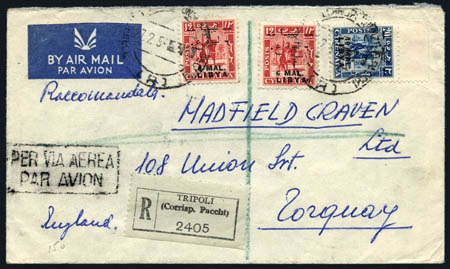 Libya, 1951, 6mal, 10mal on Registered Cover to England, Sassone #28-29, tied by Tripoli 27.2.52 cancels, Torquay 29 FE 52 receiving cancel on reverse, scarce modern item, Fine to Very Fine. Scott #106-107. Sassone €1,200+. Estimate $150-200.